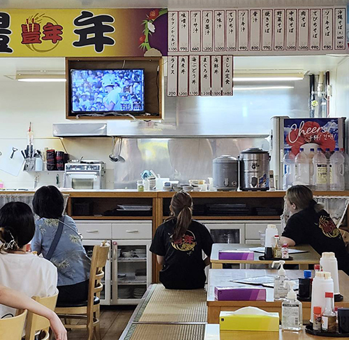 おそらく、みんなが見えやすい位置にテレビを持ってきたせいで、お店の看板がガッツリ隠れている。つまりは、お店<甲子園。この様子からも、沖縄県民にとって地元の高校球児を応援することがどれだけ優先順位の高いものなのかがわかる。