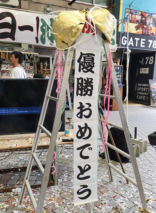 てことで、現場がザワついている間に、実は試合が終わってしまったんだけど(なんてこった!)、近くのお店のテレビモニターを見て勝利を知った観客からは、悲鳴にも似た大歓声が沸き起こった。