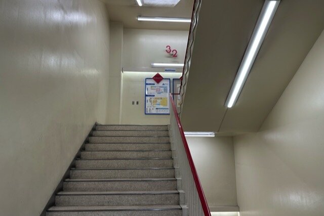 このエレベーター、建物正面から見える赤いカゴのやつで、当時はかなりモダンだったんだろうなぁと思いました(当時から赤かったのかは知らないけれど)。