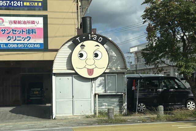 あと、ネーブルカデナじゃないんですが、駐車場の出口にあるトーマスみたいなやつも気になります。こちらも情報をお待ちの方がいればぜひ。