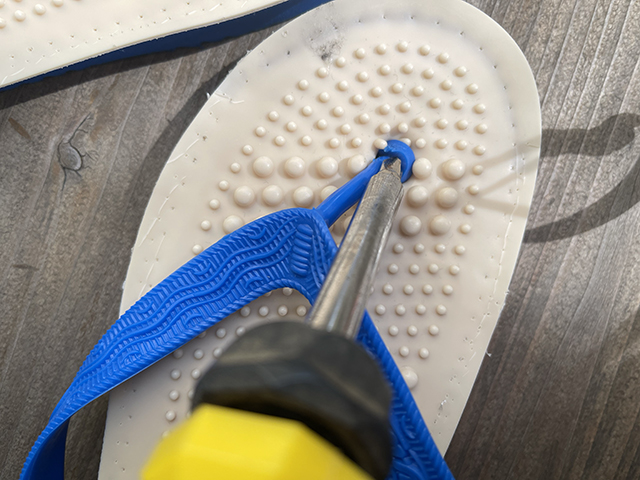 インソールと島ぞうりがくっついたら、鼻緒を通していきます。