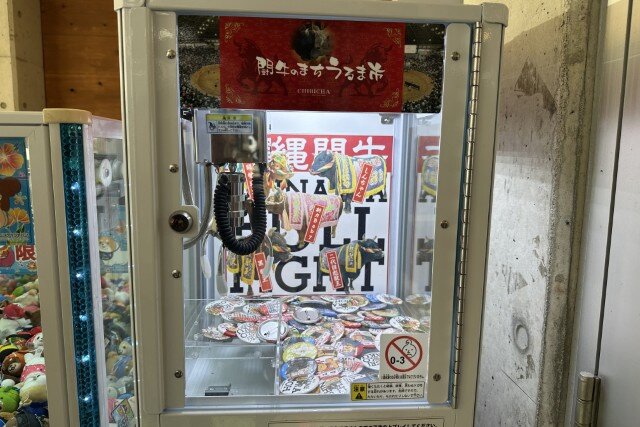 恩納村のおんなの駅にありました。闘牛の缶バッチが取れるUFOキャッチャー。闘牛ファンには刺さるのでしょうか。